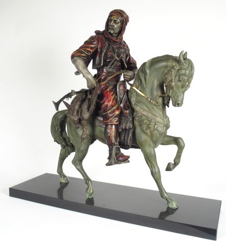 Grand sujet en régule polychrome 'Cavalier arabe' sur son socle en marbre noir. H. totale. 59 cm