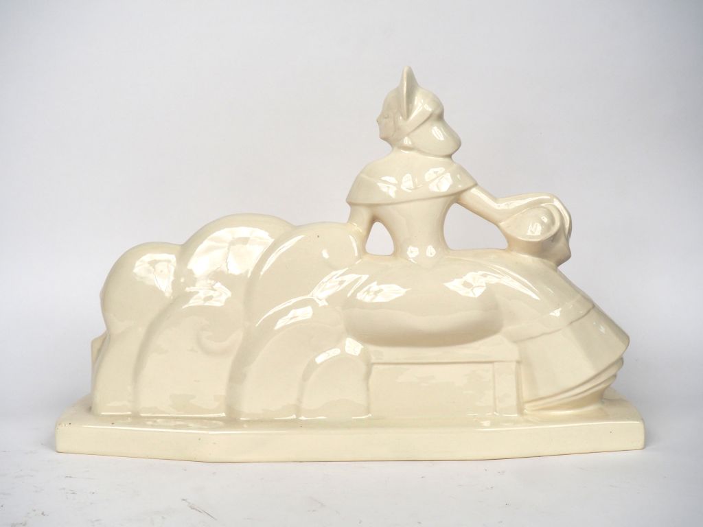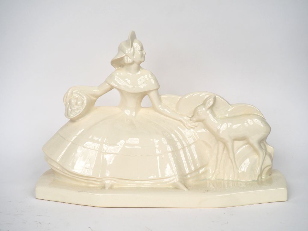 Lot de Groupe Art Déco en céramique blanche "élégante au faon". Dim. 31,5 x 4 au prix de 150 à 200 € en vente aux enchères par l'hôtel des ventes Primardeco