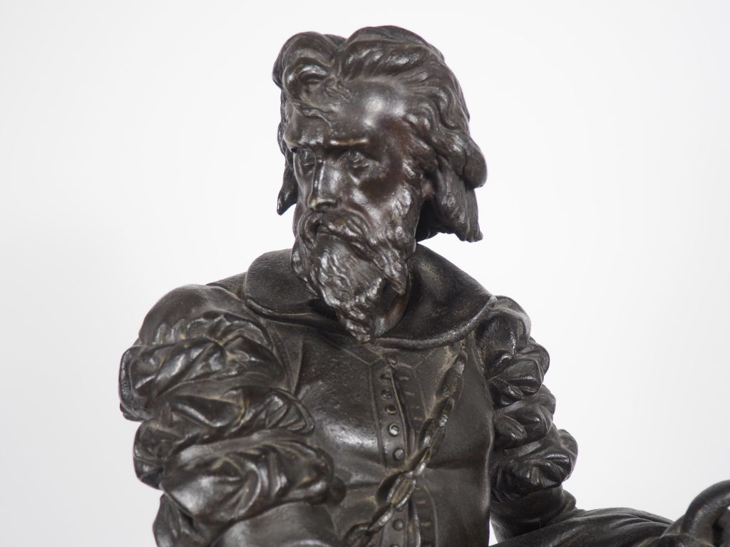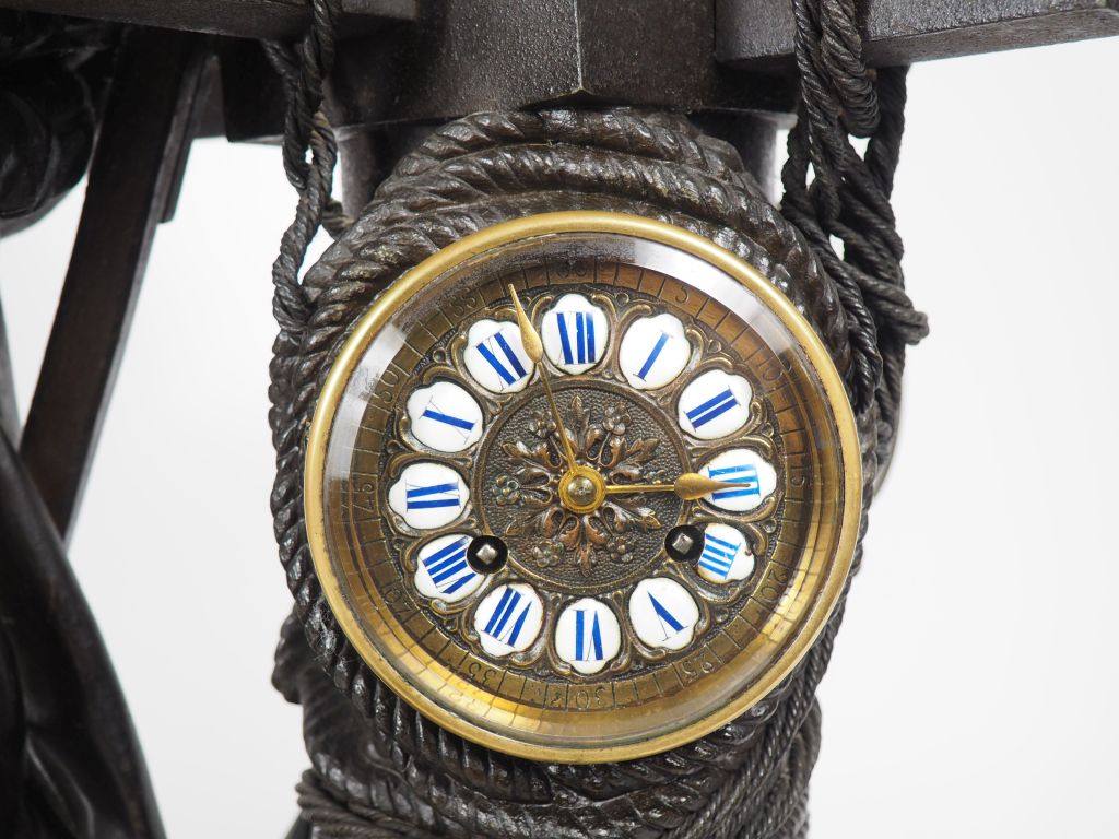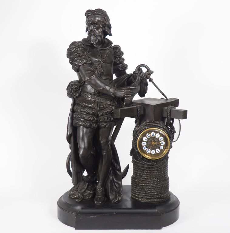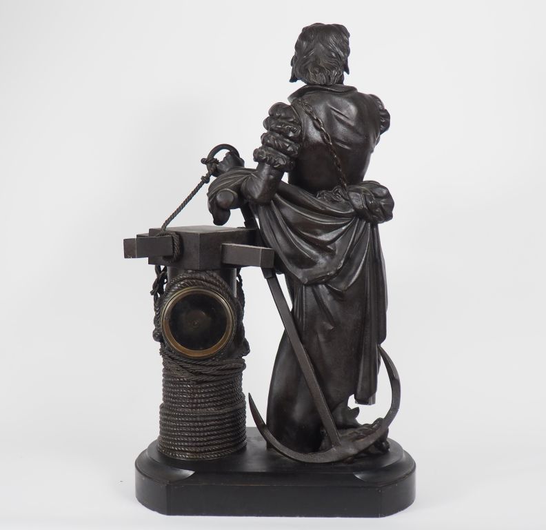 J. CARRIER. "Le capitaine de vaisseau". Importante sculpture en fonte de fer, agrémentée d'une pendule aux chiffres du cadran émaillés, base en marbre noir. Signée. Dim. 80 x 48 x 28 cm. (Accident à l'ancre)