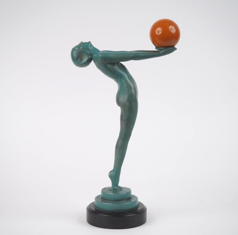 LE VERRIER. "danseuse nue à la balle" Sujet en régule patiné vert et composition, socle marbre noir. H, 33,5 cm