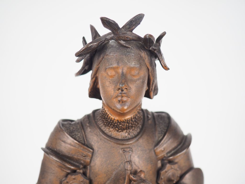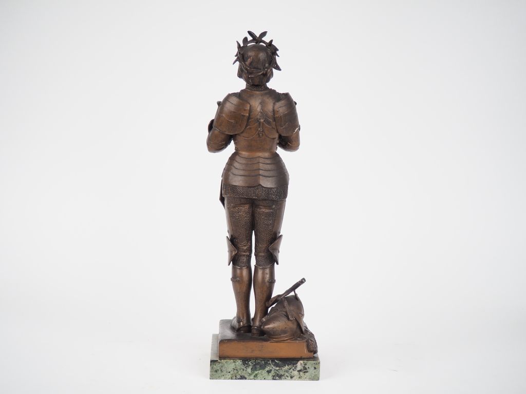MERCIE. Sujet en régule à patine médaille "Jeanne d'Arc", socle en marbre vert. Signé H. avec le socle : 33,5 cm