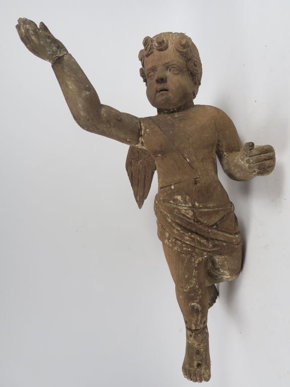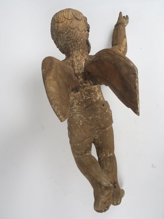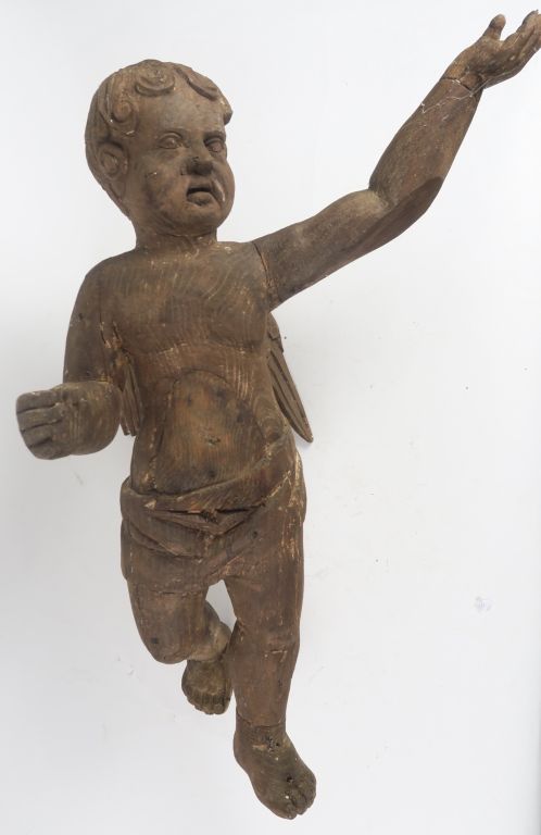 Lot de Paire d'anges XIXème en bois naturel sculpté. H. 74 cm (accidents et au prix de 500 à 750 € en vente aux enchères par l'hôtel des ventes Primardeco