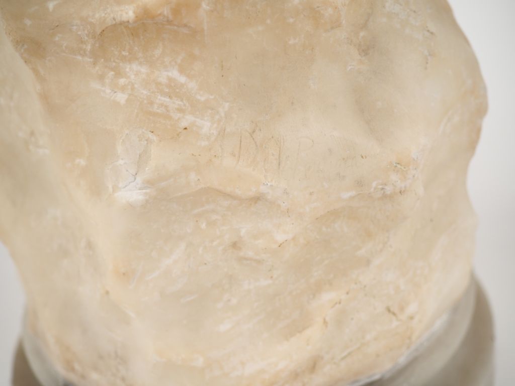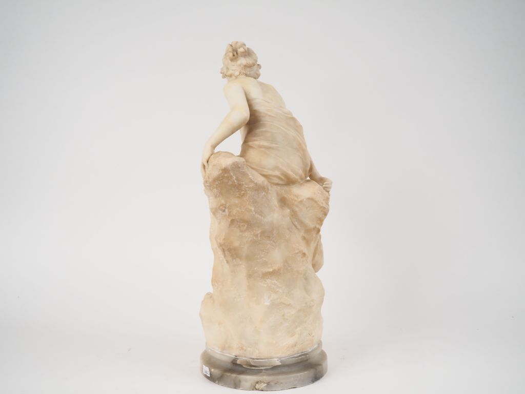 Sculpture en albatre "jeune fille dénudée sur un rocher". Signée (restauration au cou) H. 46,5 cm