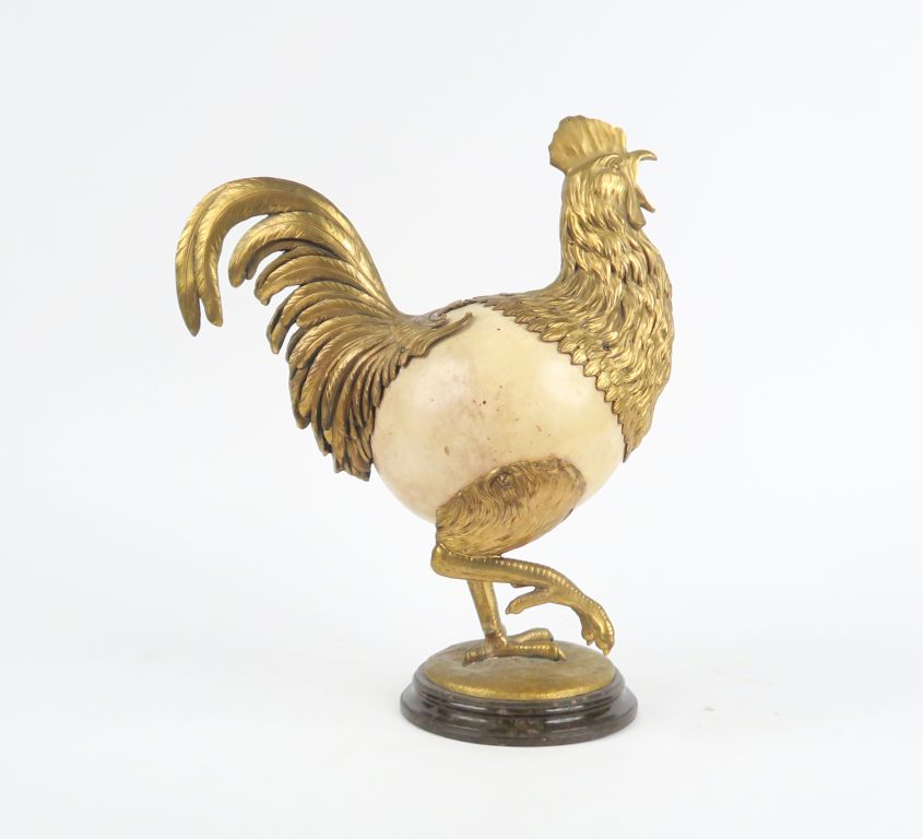 Sculpture fin XIXème début XXème en métal doré gravé et œuf d'autruche figurant un coq chantant. H. 36 cm