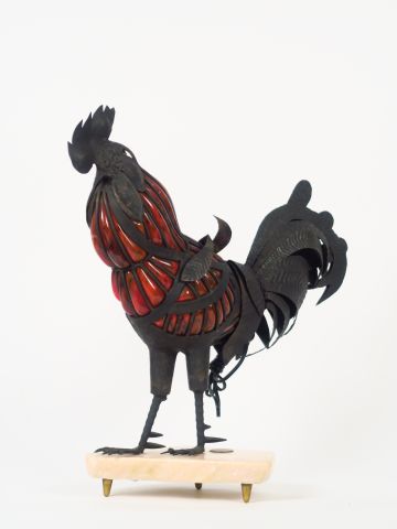 Sujet en tôle et verre poudré rouge "Coq", reposant sur un socle en albâtre. Electrifié. H. 50 cm