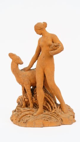 Sylvestre CLERC "Femme et biche". Sculpture en terre cuite. Signée. H...