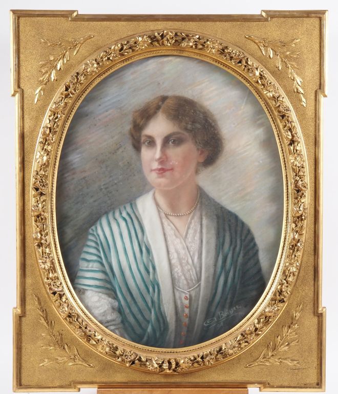 BOISSET. "portrait d'élégante au collier de perles" Pastel, signé en bas à droite Dim. À vue : 62 x 48 cm dans son cadre d'origine en médaillon de style Louis XVI en stuc doré Dim. Du cadre : 80,5 x 66,5 cm