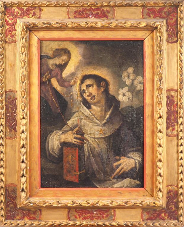 Ecole d'Italie du Nord vers 1620, entourage de Morrazzone. "Saint Dominique recevant le rosaire de la Vierge" Toile marouflée sur panneau Hauteur : 54 cm Largeur : 37,5 cm Restaurations anciennes Expert : Cabinet Turquin - Stéphane Pinta.