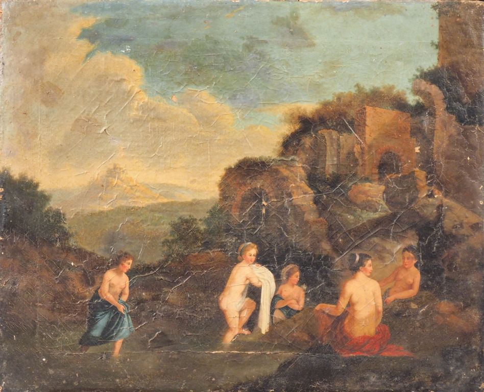 Ecole du nord fin XVIIIème. "Jeune filles aux bains". Huile sur toile. Dim. 32 x 40 cm. (mauvais état)