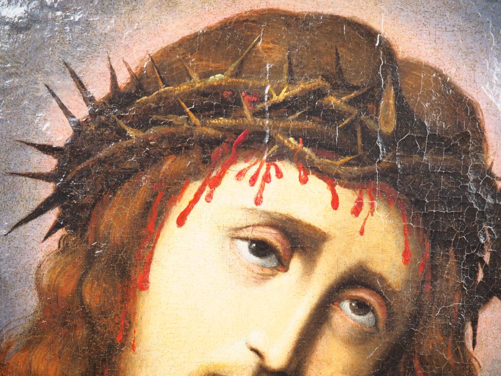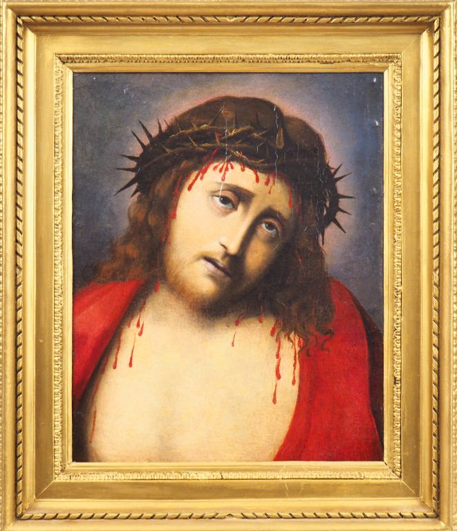 Ecole espagnole ou italienne XVIIIème dans le gout de RIBERA. "Ecce Homo". Huile sur panneau. Dim. 41,5 x 33 cm. (Restaurations).
