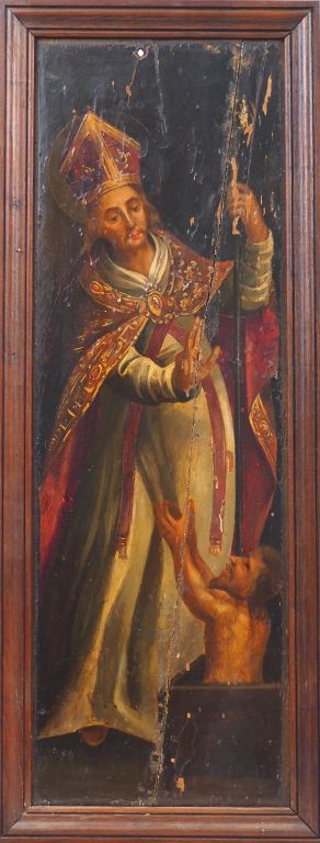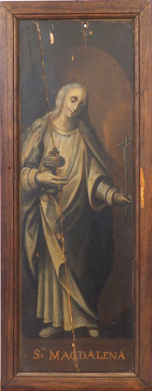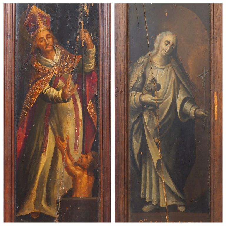 Ecole flamande vers 1600. « Sainte Madeleine » et « Saint évêque » Huiles sur panneau de chêne double face. 69 x 22.5 cm (panneau fendu)