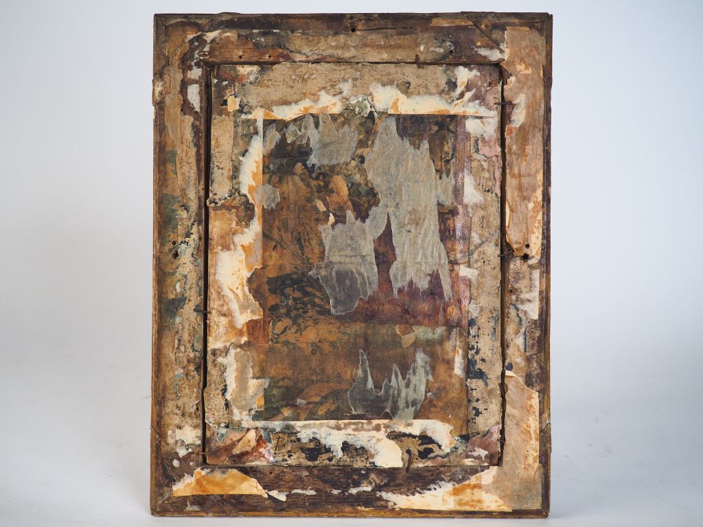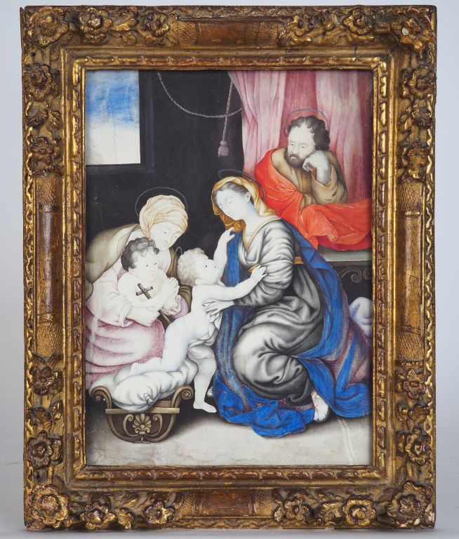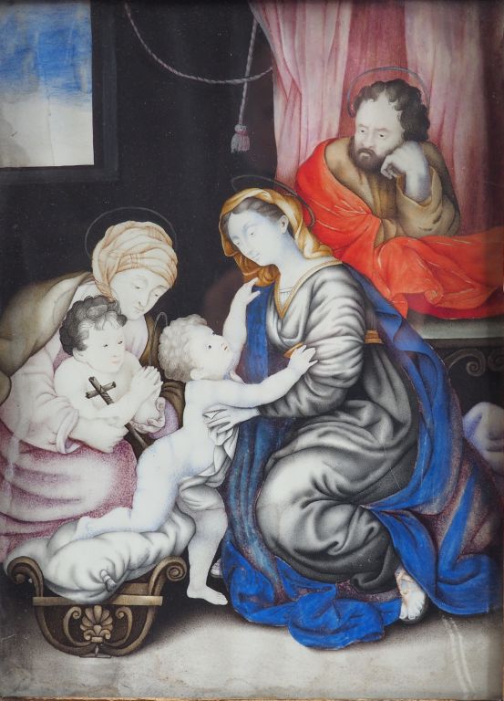 Ecole française dans le goût du XVIIème "La Sainte famille". Peinture sur vélin, dans un cadre en bois doré d'époque. Dim. 26 x 19 cm. (accidents)