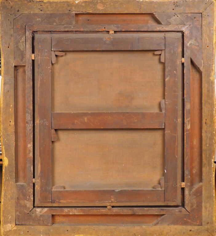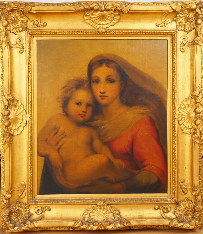 Ecole française début XIXème. "Vierge à l'enfant" Huile sur toile. Beau cadre Napoléon III en bois et stuc doré. Dim : 82 x 66 cm.