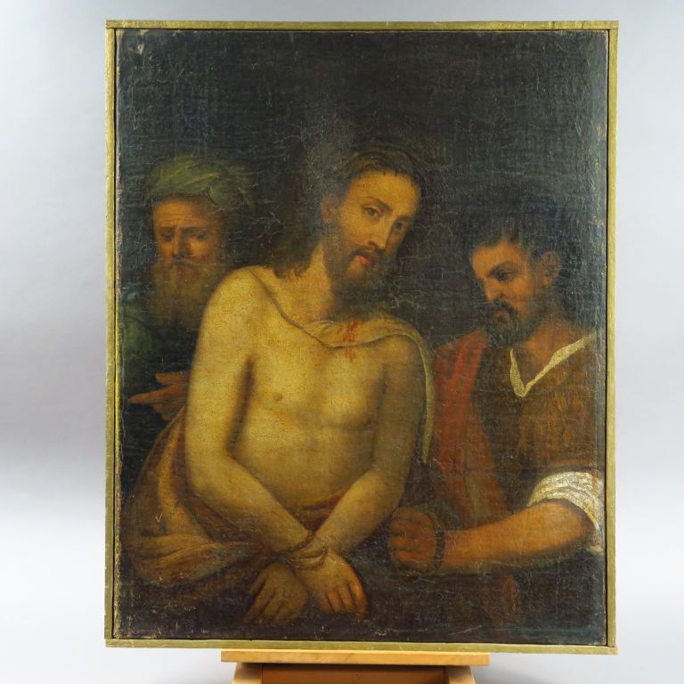 Ecole française début XVIIIe. "Christ aux liens". Huile sur toile. Dim. : 73,5 x 58,5 cm. (réentoilé)