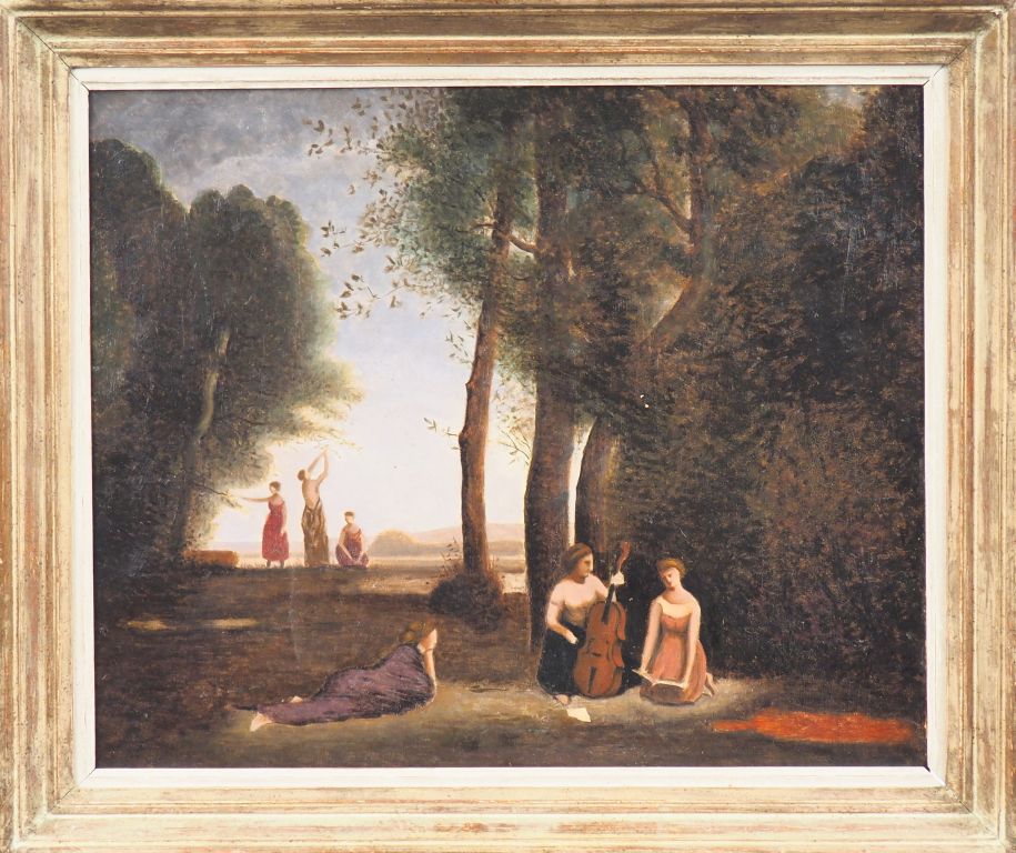 Ecole française début XXème. "La leçon de musique". Huile sur toile. Dim. 50 x 61 cm. (Sauts de peinture).
