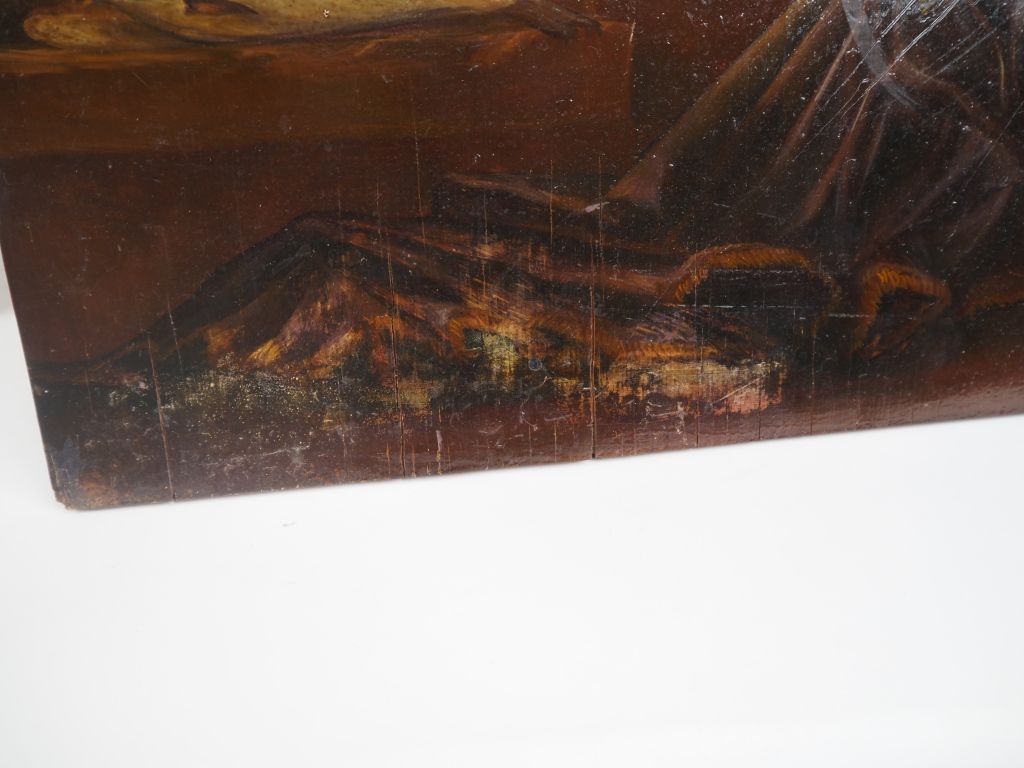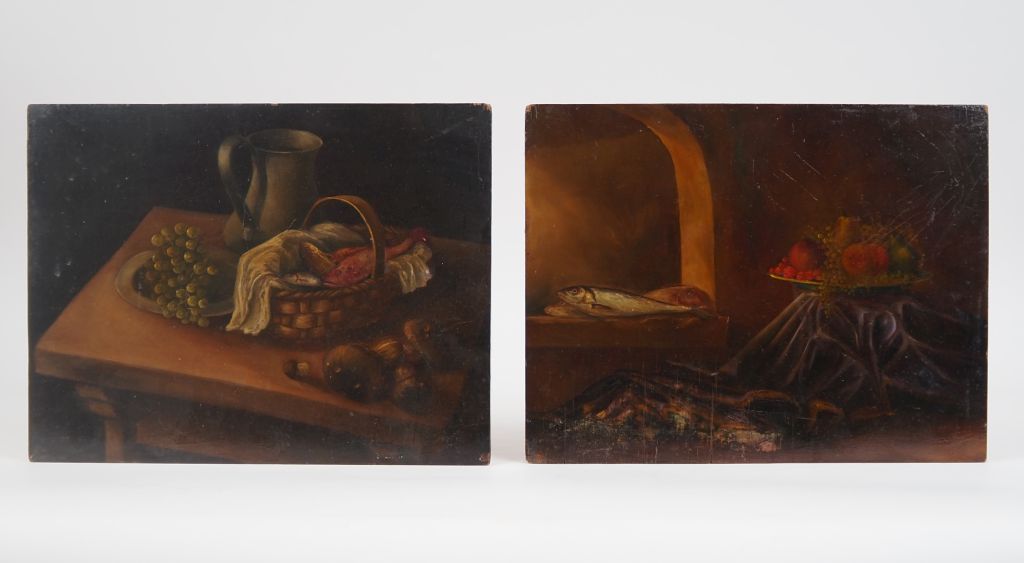 Ecole française fin XIXème. "Natures mortes aux poissons et aux fruits". Paire d'huile sur panneaux. Dim. 27 x 35 cm. (fentes)
