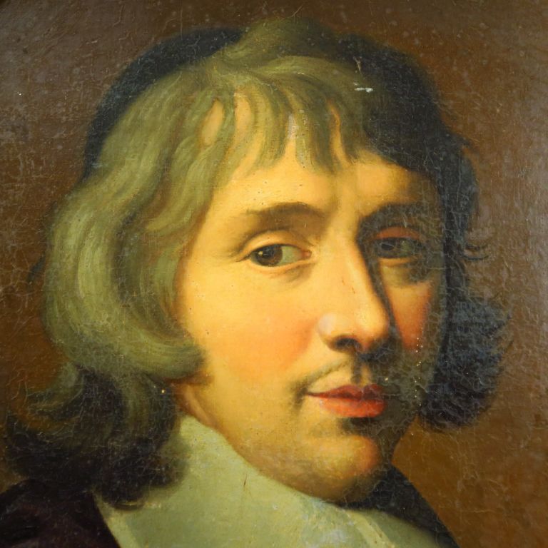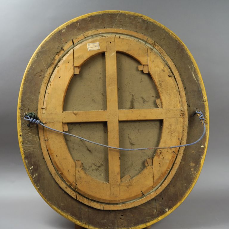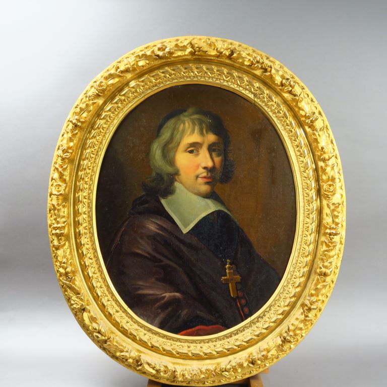 Ecole française fin XVIIIe. "Portrait de Jean de Roquette, Evêque d'Autun". Huile sur toile, dans son cadre médaillon en bois et stuc doré. Dim. : 65,5 x 54 cm