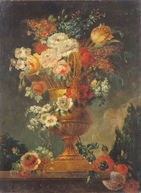 Ecole française fin XVIIIème début XIXème. "Bouquet de fleurs dans un vase sur un entablement" Dim. 78,35 x 58,5 cm
