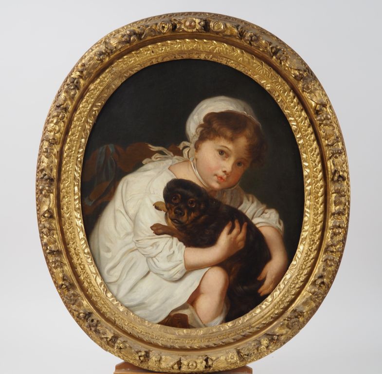 Ecole française fin XVIIIème debut XIXème. "Jeune fille et son chiot". Huile sur toile ovale. Dim. 65 x 56 cm.