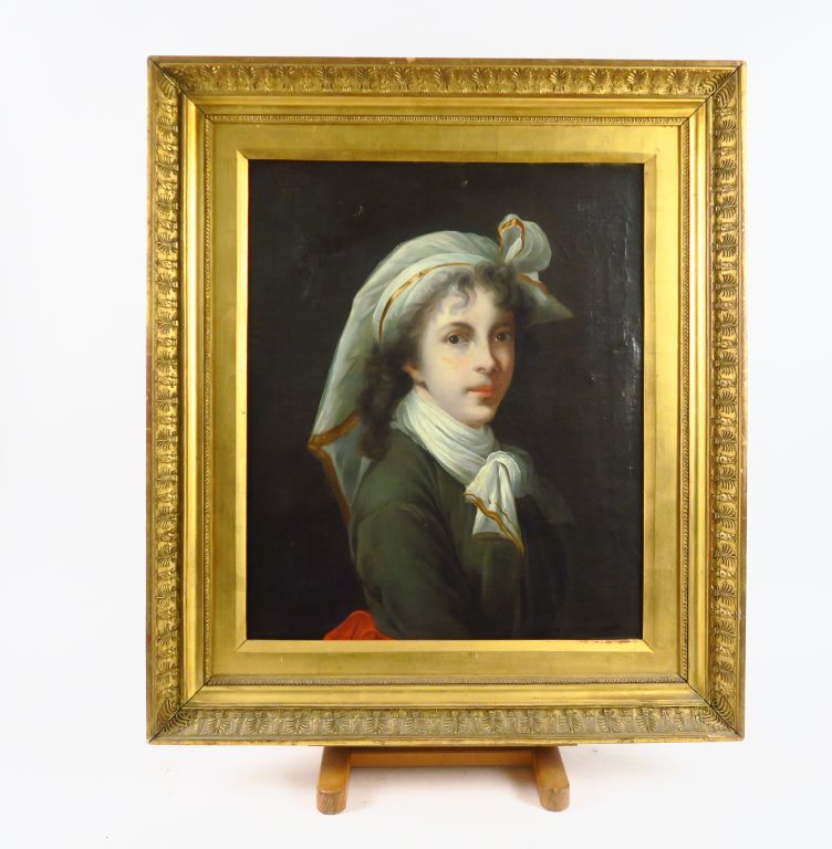 Ecole française fin XVIIIème - début XIXème "Portrait de jeune femme au fichu". Huile sur toile. 62,5 x 50 cm (restaurations)