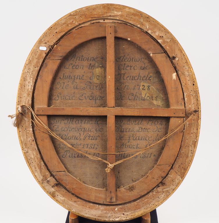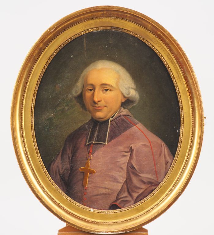 Ecole française fin XVIIIème - début XIXème. "Portrait de Monseigneur Léon Archevêque de Paris et Duc de Saint Cloud". Huile sur toile, dans un cadre ovale, identifié au dos. Dim. 65 x 53 cm. (Craquelures, restauration).