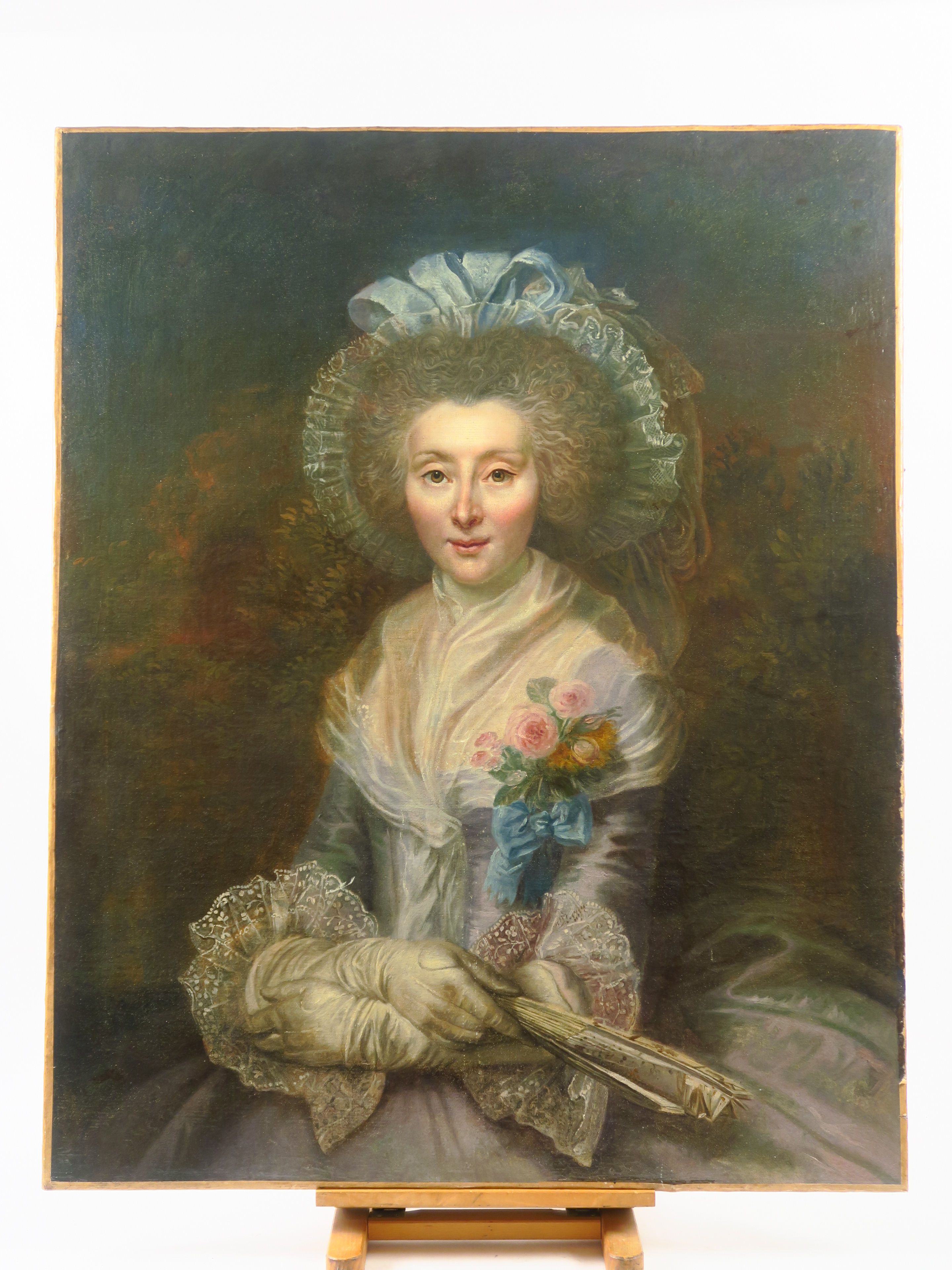 Ecole française fin XVIIIème - début XIXème "Portrait d'élégante au bouquet de fleur" Huile sur toile (réentoilée). 101 x 82 cm (restaurée)