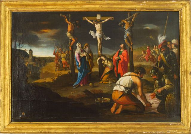 Ecole FRANCAISE vers 1650 'Le Christ entre les deux larrons avec les soldats jouant aux dés au premier plan' Toile agrandie d'une bande de bois de 4 cm en partie inférieure 83,5 x 129 cm Restaurations anciennes Expert : Cabinet Turquin