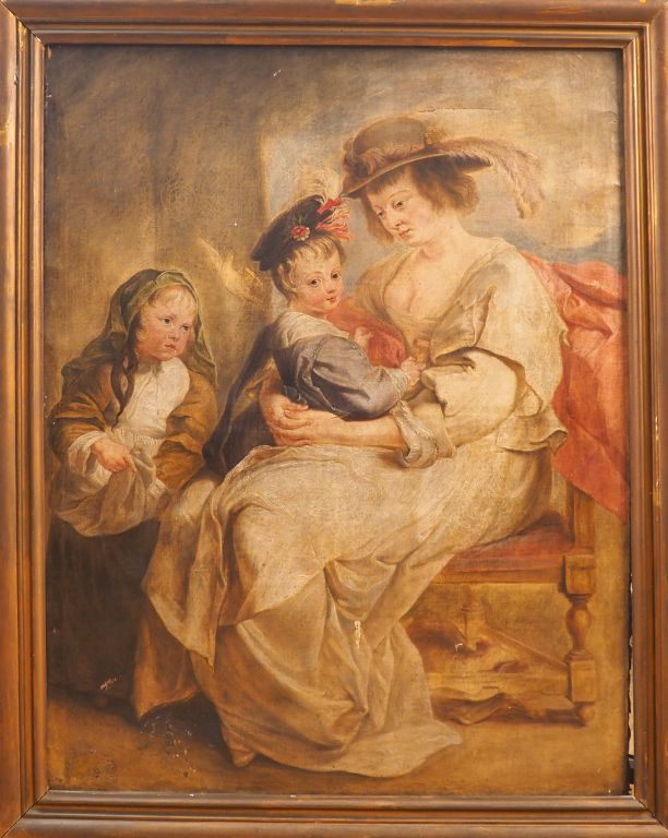 École FRANÇAISE vers 1800 d'après Rubens. "Portrait d'Hélène Fourment et ses enfants" Toile d'origine Hauteur : 118 cm Largeur : 90 cm Accidents et restaurations anciennes Expert : Cabinet Turquin - Stéphane Pinta.