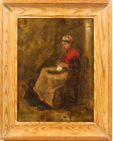 Ecole francaise XIXème 'Jeune fermière à son ouvrage'. Huile sur panneau 33 x 25 cm
