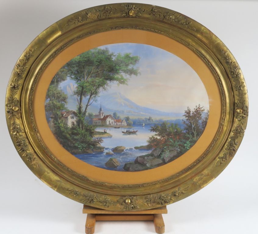 Ecole française XIXème "Paysages lacustres animés en montagne" Paire de gouaches en médaillon. Dans leur cadre en bois et stuc doré. 48,5 x 62 cm