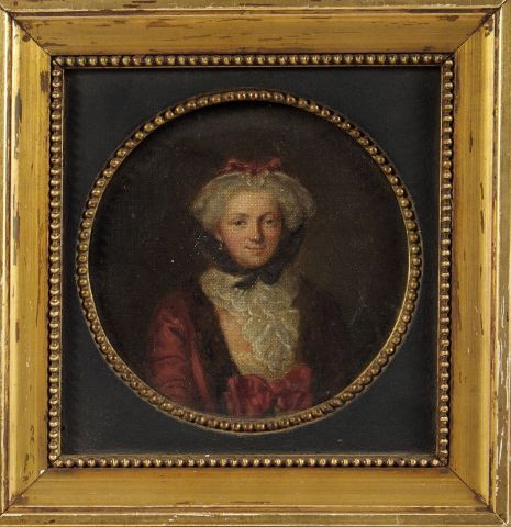 Ecole française XIXème "Portrait de dame à la robe de soie pourpre". Huile sur toile marouflée sur panneau, mise en tondo. Diam. : 14 cm