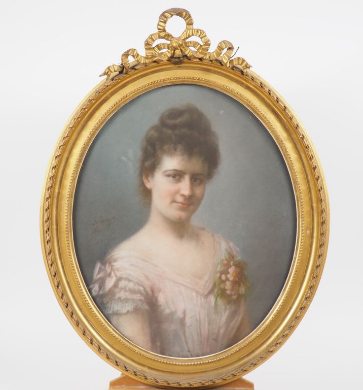 Ecole française XIXème. "Portrait de jeune femme à la robe de soie parme". Pastel sur toile signé et daté au milieu à gauche. Dim. (à vue) : 59 x 49 cm.
