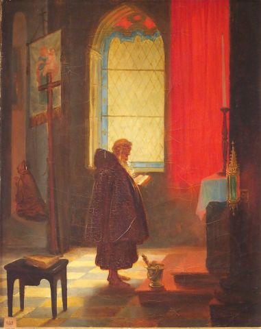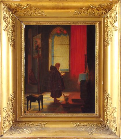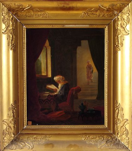 Ecole française XIXème "Religieux oriental à la lecture" et "Moine lisant son brévière". Paire d'huiles sur toile. 41 x 32,5 cm