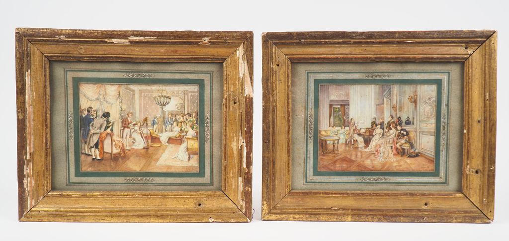 Lot de Ecole française XIXème. "Salon de musique" Paire de gouaches. Dim. 1 au prix de 100 à 200 € en vente aux enchères par l'hôtel des ventes Primardeco