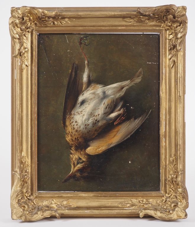 Ecole française XIXème. "Trophée de chasse". Huile sur panneau, signée en bas à droite. Dim. 22,5 x 17,5 cm. (Fente)