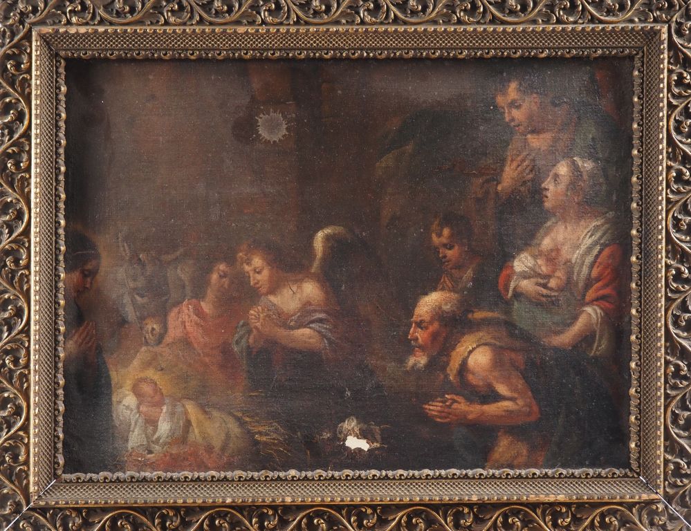 Ecole française XVIIIème. "La nativité". Huile sur toile marouflée sur carton. Dim. 25,5 x 35 cm. (sauts de peinture)