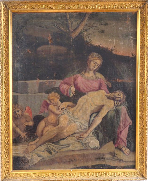 Ecole française XVIIIème. "La pieta". Huile sur toile, marouflée sur panneau. Dim. 73 x 58 cm. (accidents)