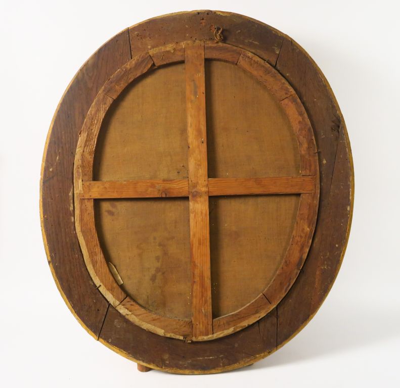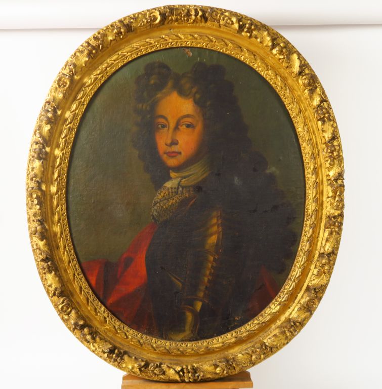 Ecole française XVIIIème "Portrait de jeune homme en armure". Huile sur toile, dans son cadre XVIIIe en bois et stuc doré à décor de rinceaux et de fleurs. (Accidents et restaurations) Dim. 74 x 60 cm.