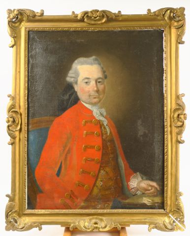 Ecole française XVIIIème "Portrait de jeune homme en habit rouge" Huile sur toile, cadre d'époque en bois doré (redoré) (restaurations) 84 x 63,5 cm