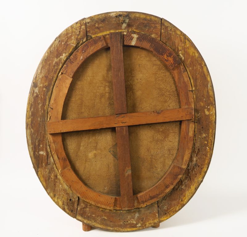 Ecole française XVIIIème "Portrait d’homme à la collerette". Huile sur toile, dans un cadre XVIIIe en bois et stuc doré à décor de rinceaux et de fleurs. Dim. 65 x 54 cm.