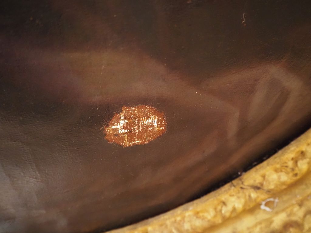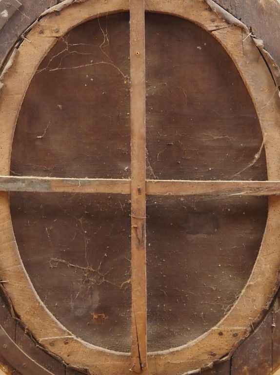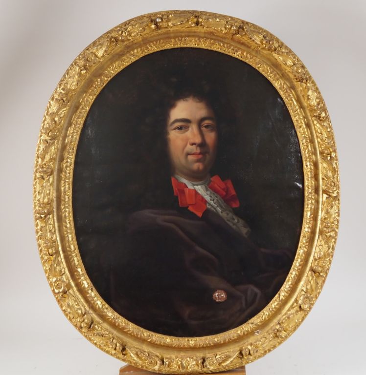 Ecole française XVIIIème. "Portrait d'homme à la lavallière blanche et rouge". Dim. 75 x 57 cm. Huile sur toile ovale. (restaurations et accidents).