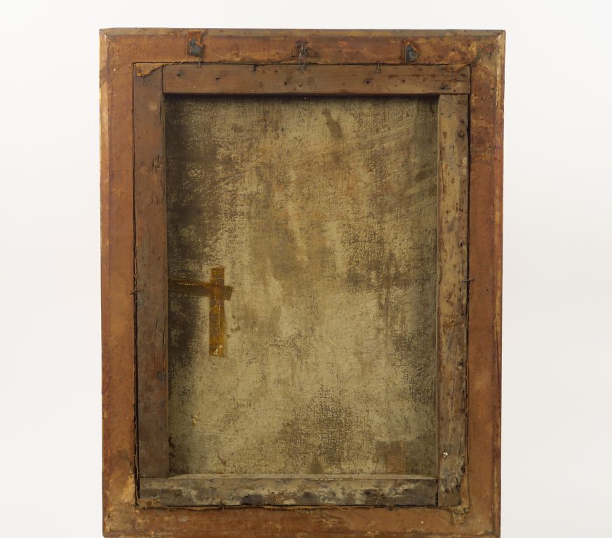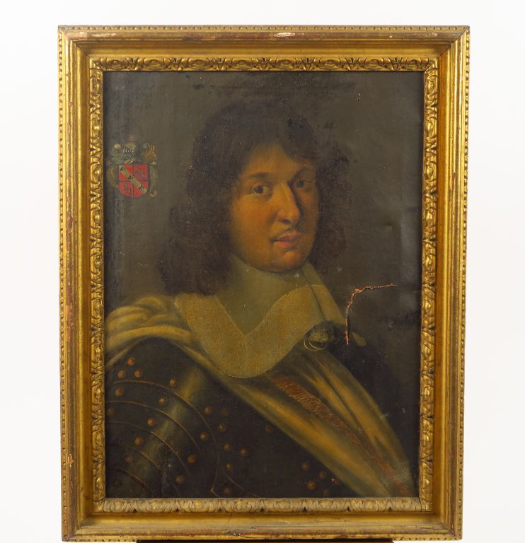 Ecole française XVIIIème "Portrait d’homme en armure aux armoiries". Huile sur toile, dans un cadre XVIIIe en bois et stuc doré à décor de frises de perles. (Accidents) Dim. 54.5 x 40.5 cm.