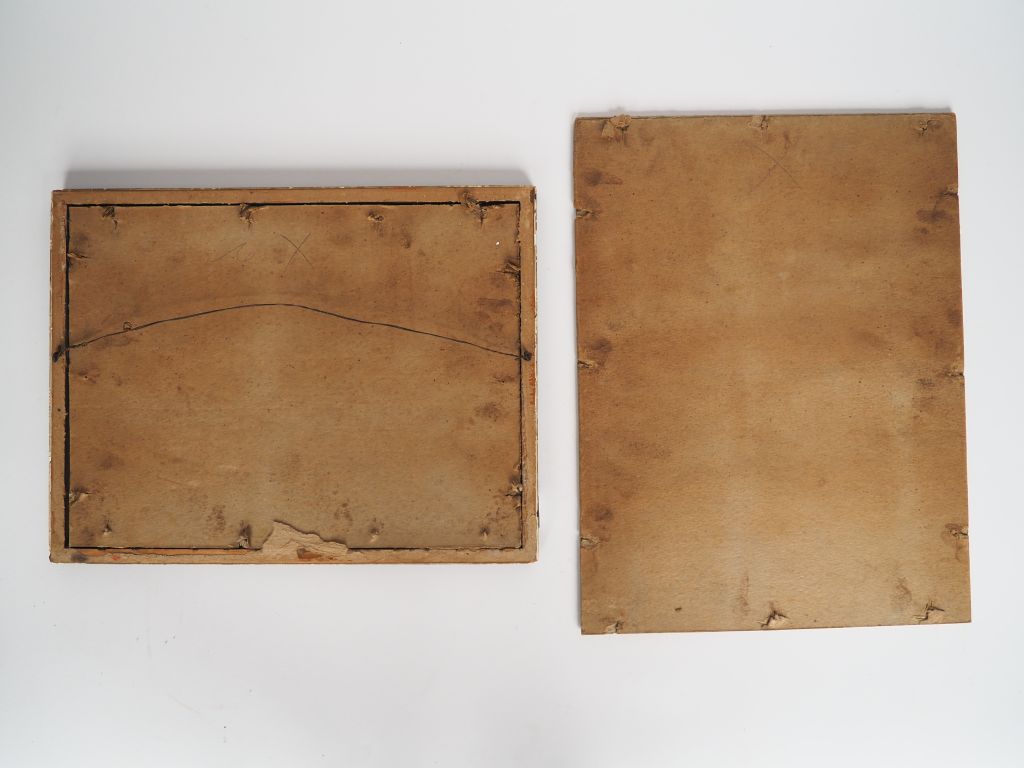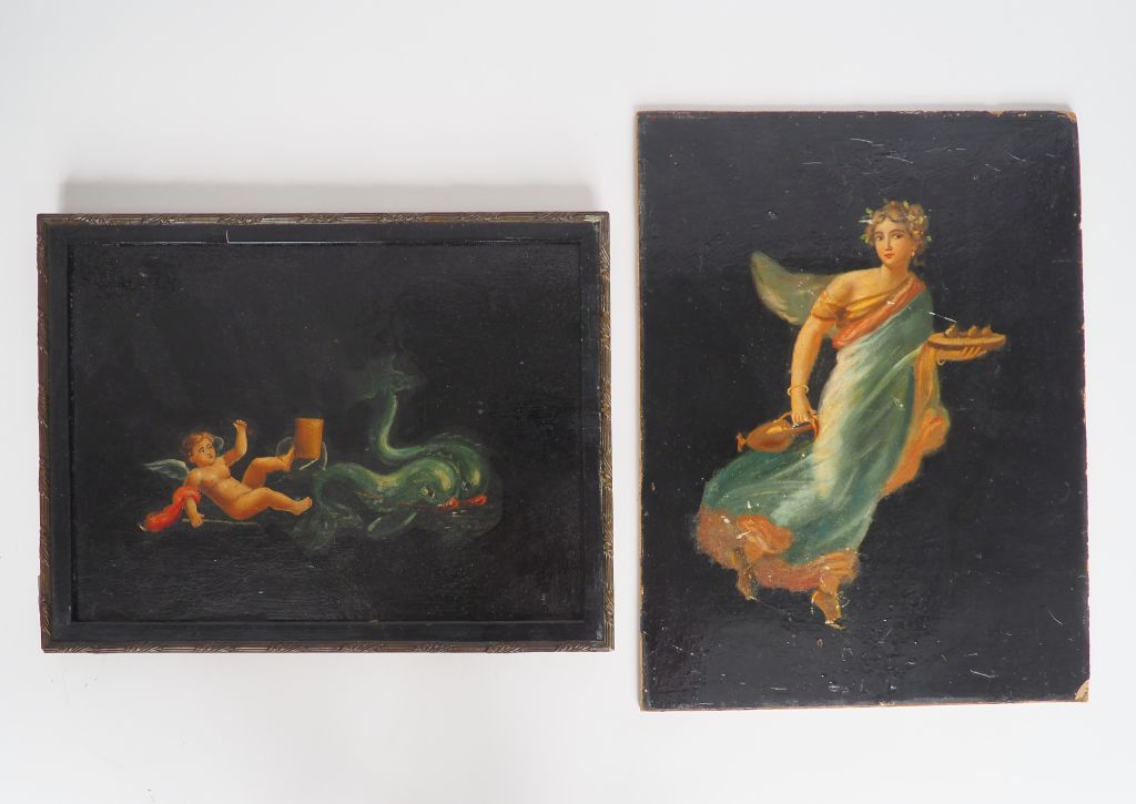 Ecole italienne fin XIXème - début XXème. "Amour au char et "servante". 2 différentes huiles sur carton d'après les fresques de Pompéï. Dim. 37 x 28 cm. Dim. 32 x 23,5 cm.