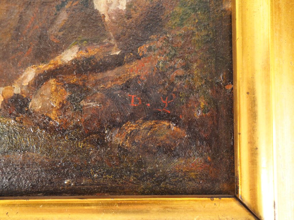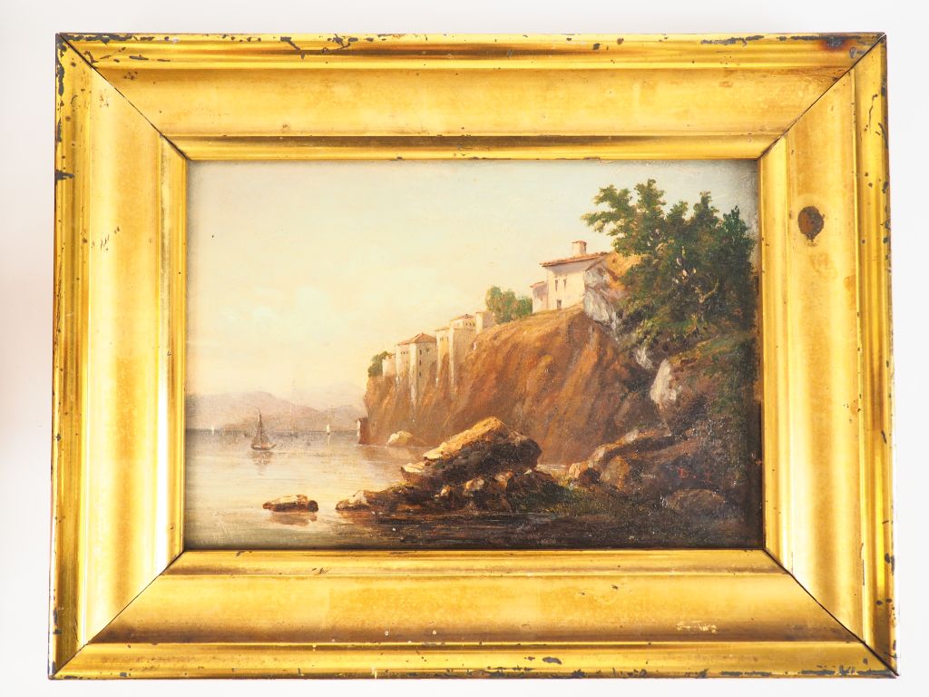 Ecole italienne XIXème. "La cote vue du rivage". Huile sur toile marouflée sur panneau, monogrammée D.L en bas à droite. Dim. 18 x 26 cm.