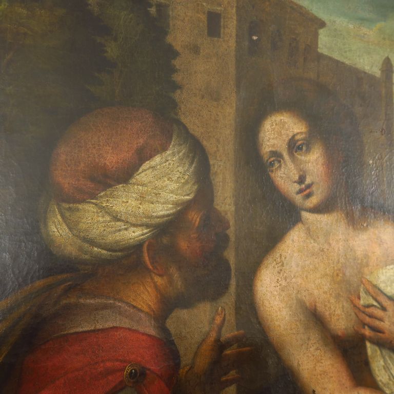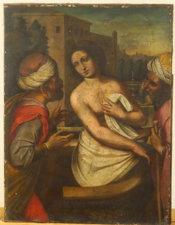 Ecole italienne XVIIème "Suzanne et les Vieillards" Huile sur toile. 139 x 106 cm (réentoilée, accidents)