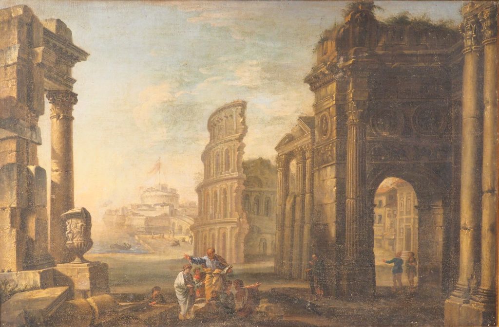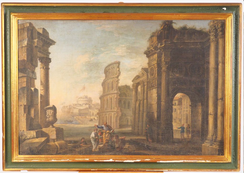 Ecole italienne XVIIIème. "Personnages dans les ruines de la Rome antique". Huile sur toile. Dim. 51,5 x 78 cm. (réentoilée)