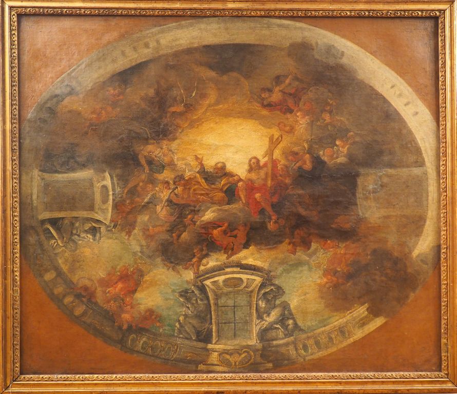 Ecole romaine de la fin du XVIIIème siècle, suiveur de Benedetto LUTI. Esquisse pour un plafond avec le Christ et Dieu le Père soutenus par des anges Toile Hauteur : 90,5 cm Largeur : 107,5 cm (accidents et restaurations)