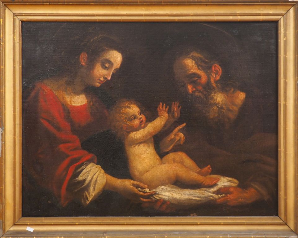 Ecole ROMAINE vers 1650, entourage de GRAMMATICA "Sainte Famille" Toile Hauteur : 75 cm Largeur : 99 cm (Restauration). Expert: Cabinet Turquin - Stéphane Pinta