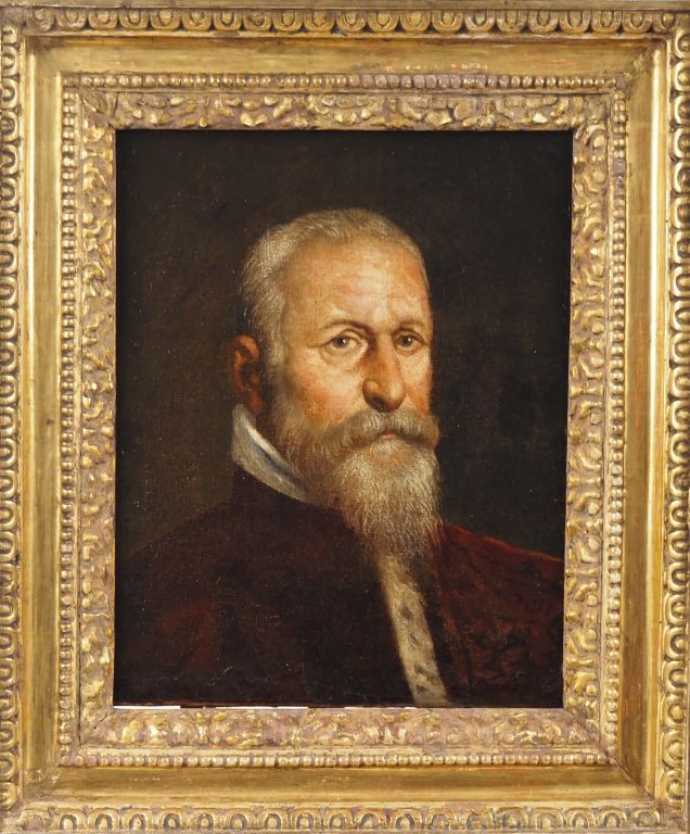Ecole vénitienne du XIXème, dans le goût de TINTORET. "Portrait de vénitien". Huile sur toile dans un cadre XVIIème. Dim 53 x 43 cm. (restaurations anciennes)