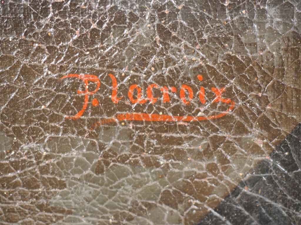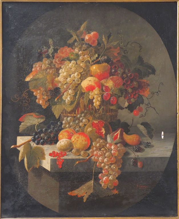 Ecole XIXème signée P. LACROIX. "Nature morte aux fruits sur un entablement" Huile sur toile. Dim. 76,5 x 62 cm. (accidents et restaurations).